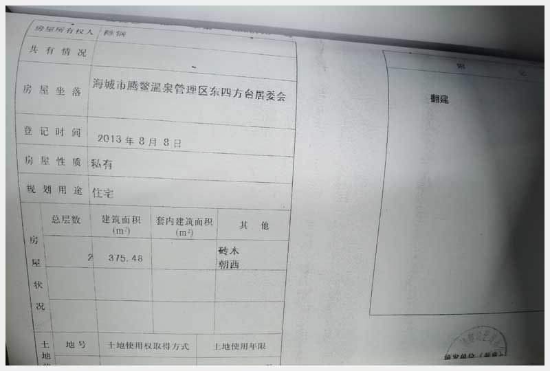 名稱:海城市騰鰲溫泉管理區(qū)東四方臺(tái)房產(chǎn) 面積:375.48㎡ 瀏覽次數(shù):1538