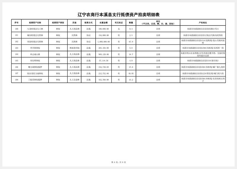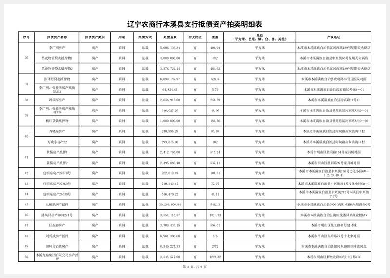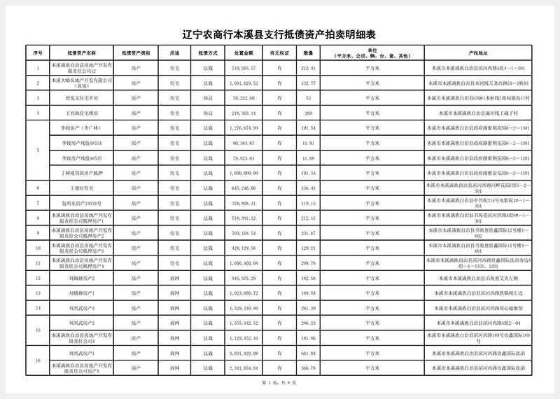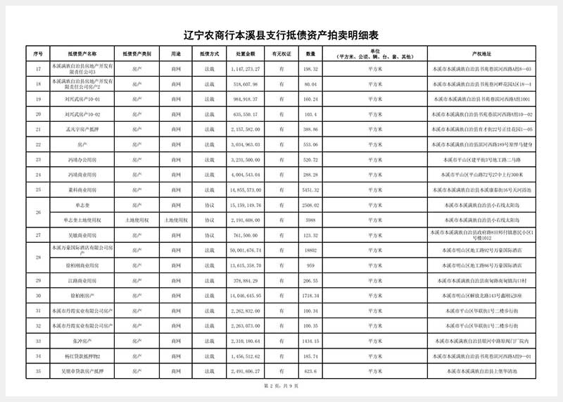 受委托定于2025年12月4日13:28分—12月5日14:28分在遼寧省公共資源拍賣網www.lngp.org.cn舉行金融機構抵債資產拍賣會,對以下資產進行公開拍賣:①燈塔市萬寶橋街道天福新城E區54號樓54-3號房產,面積:149.18㎡,起拍價:36.45萬元;②燈塔市萬寶橋街道天福新城D區25號樓25-2號房產,面積:180.82㎡,起拍價:44.55萬元。另有:①土地使用權及工廠廠房廠地場地工業園等房地產類②辦公樓住宅公寓別墅門市網點車庫商鋪檔口賓館酒店學校村舍等房產類③非農建設用地和農用地等集體土地使用權及地上建筑物及建筑附屬物④機器設備車輛玉石等物資類⑤林地林木林權類⑥金融機構閑置資產等,共計近兩百項資產(明細表附后)公開拍賣,以上資產均有瑕疵。起拍價保留價以委托方通知公布為準。詳情參考本公司網站www.lnjhpm.cn或到本公司查閱拍賣標的明細及拍賣文件。