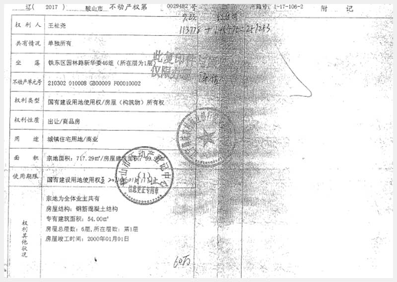 地址:鞍山市鐵東區(qū)園林路新華委46組 標(biāo)的號(hào):225-3