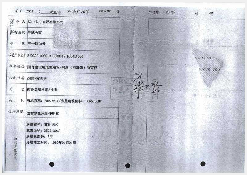名稱:鞍山市鐵東區(qū)五一路23號房產(chǎn) 面積:3865.3㎡ 瀏覽次數(shù):1054