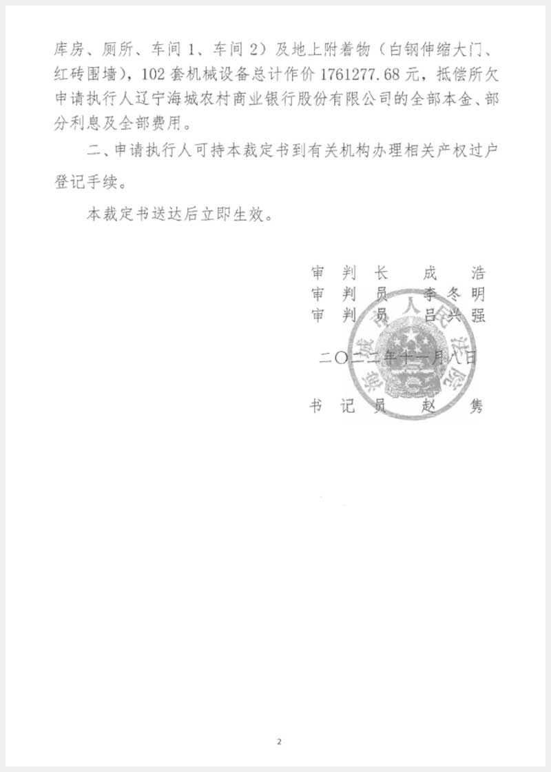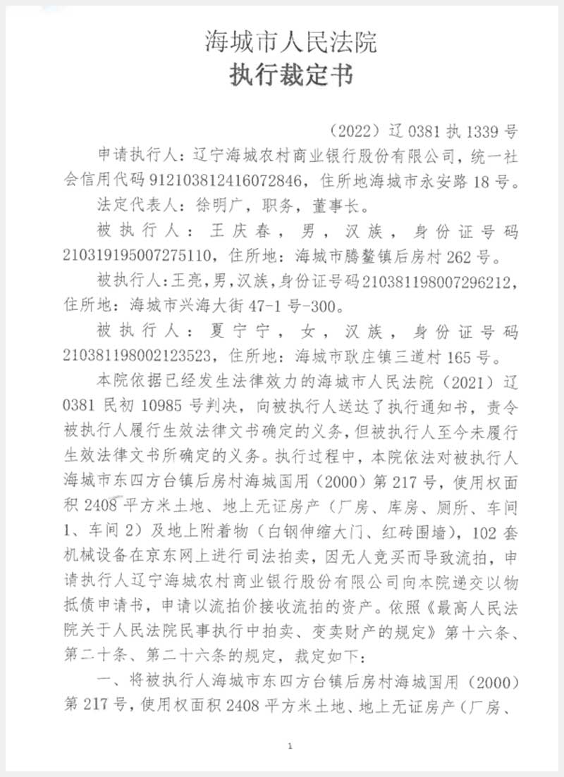 251號(hào) 海城市東四方臺(tái)鎮(zhèn)后房村房產(chǎn)、土地使用權(quán)及機(jī)器設(shè)備