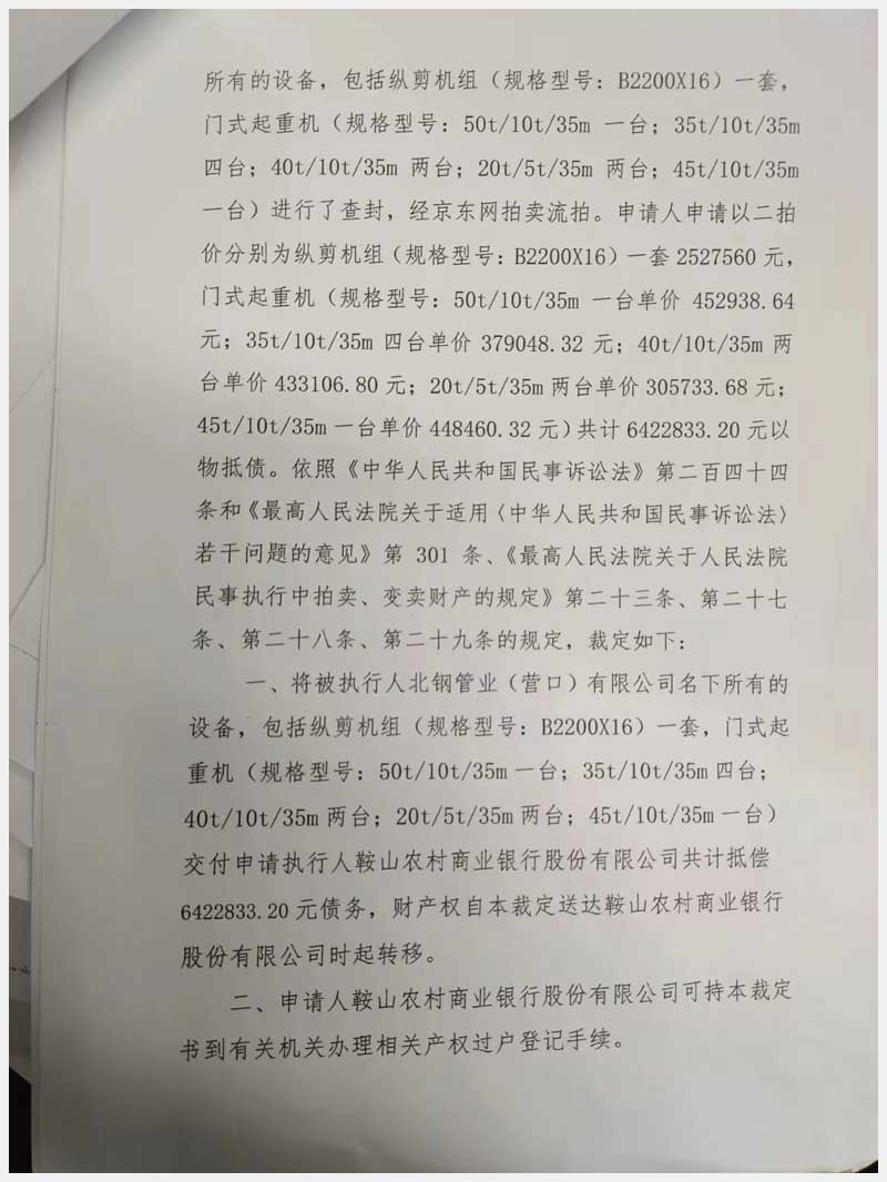 名稱:北鋼管業(yè)(營(yíng)口)有限公司所屬的機(jī)器設(shè)備 面積:11臺(tái)(套) 瀏覽次數(shù):881