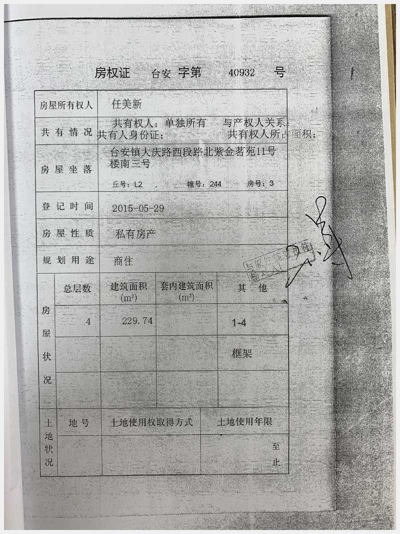 名稱:臺安鎮(zhèn)大慶路西段北紫金茗苑11號樓南四號 面積:房產(chǎn):229.49㎡、土地:112㎡ 瀏覽次數(shù):1833