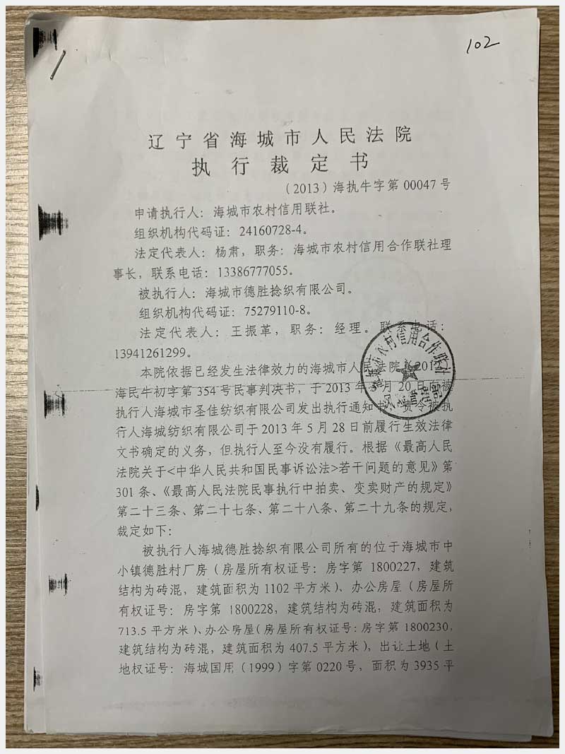 102號 海城市中小鎮(zhèn)德勝村房產(chǎn)及國有土地使用權(quán)