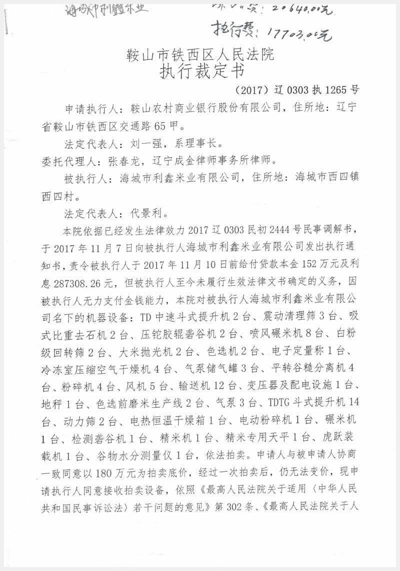 名稱:海城市利鑫米業(yè)有限公司所有的機器設備 面積:87臺 瀏覽次數(shù):2080